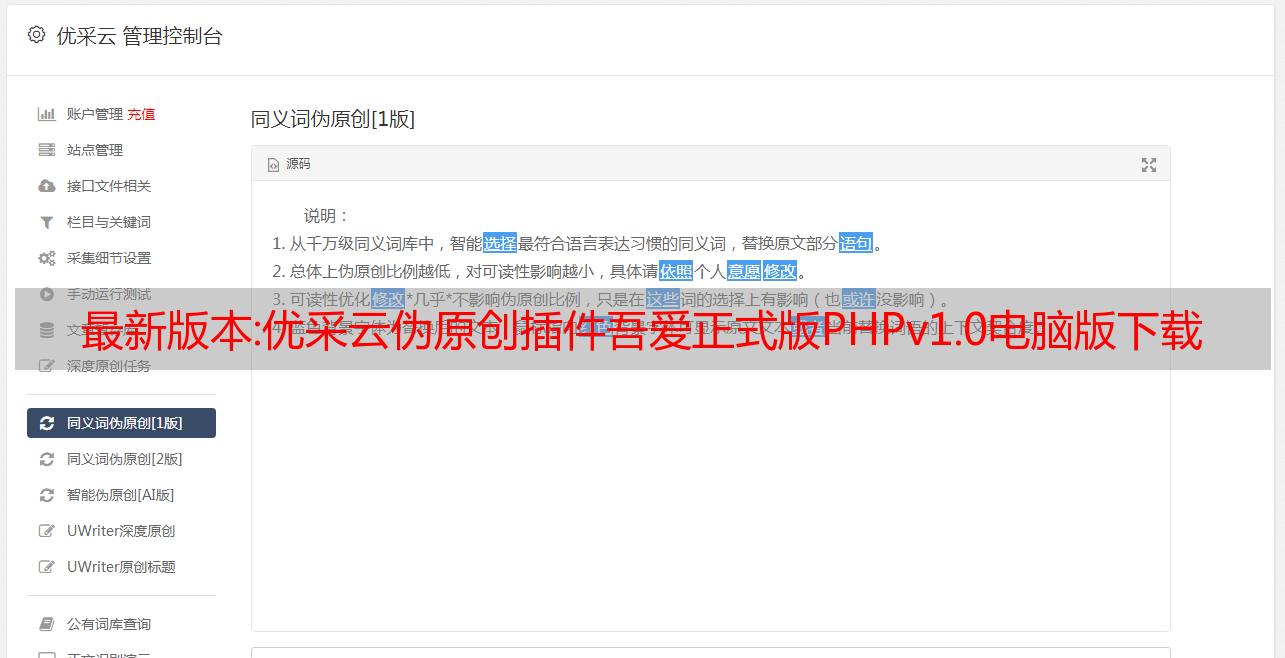 优采云伪原创我爱的插件破解版[PHP],纯PHP代码,需要编辑器才能使用。优采云伪原创工具支持自定义伪原创功能,效果出众,并且可以添加多种替换方式,基本实现了文本的深度操作伪原创 ,秒杀市场 大部分伪原创工具,无论是网站编辑、论文还是项目报告撰写,都可以轻松伪原创转换,省时省力。这次,我们带来了优采云伪原创工具的最新免费版本下载。
