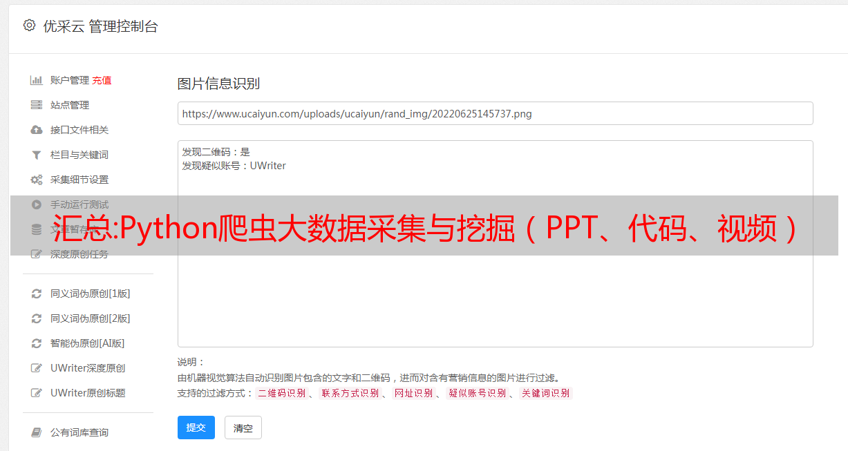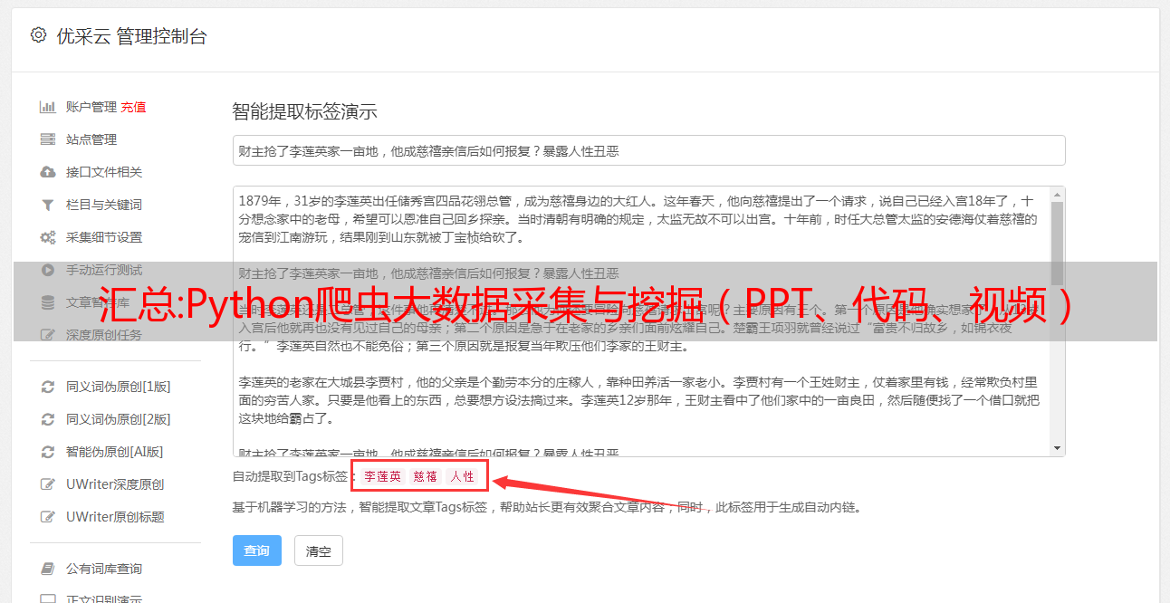 优采云 发布时间: 2022-10-05 12:12汇总:Python爬虫大数据采集与挖掘(PPT、代码、视频)
