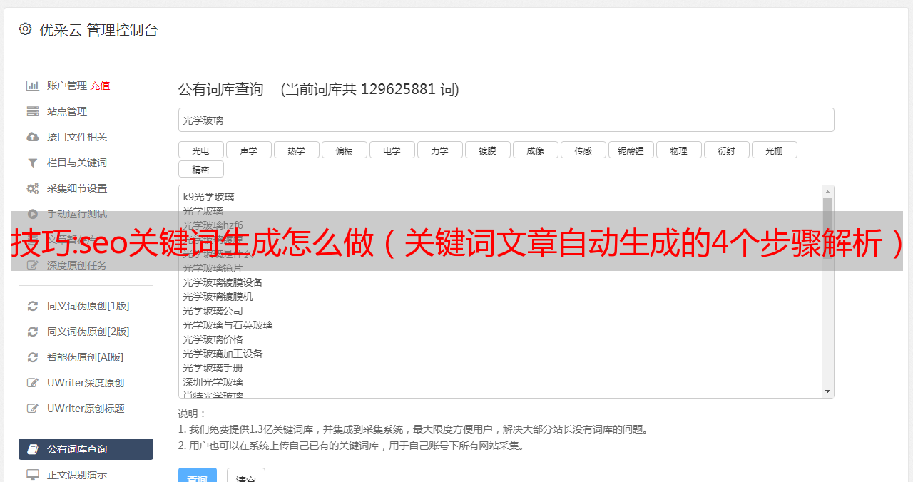 优采云 发布时间: 2022-10-08 14:17技巧:seo关键词生成怎么做(关键词文章自动生成的4个步骤解析)