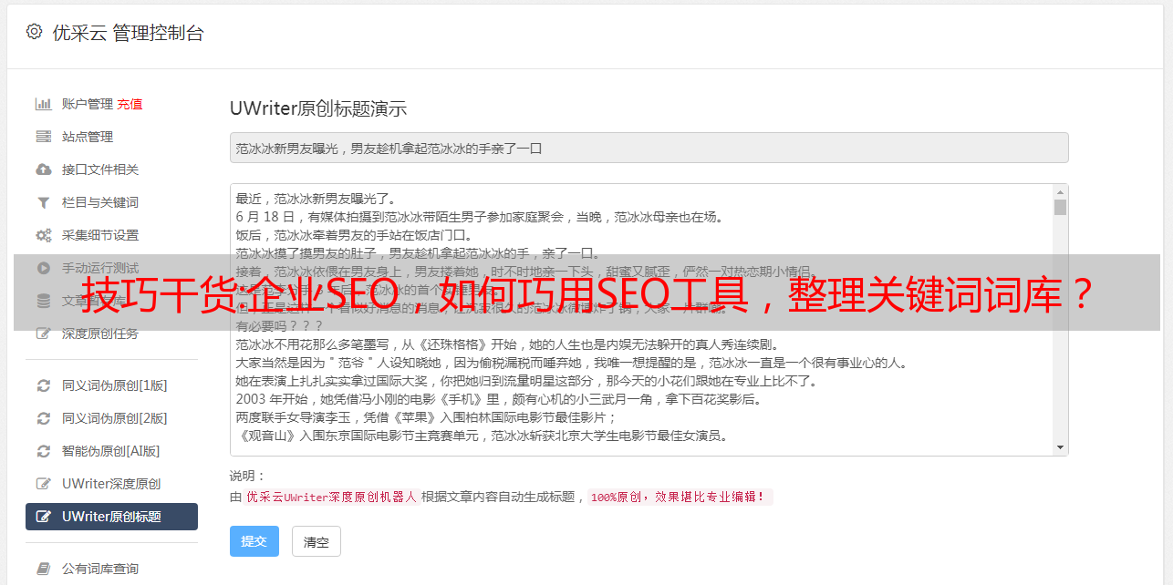 其实不仅是我们,国内几大门户网站也不全是原创文章。他们在改标题前还利用了对方的修改,这成了他们自己的“新闻”。让我谈谈这个 伪原创 工具。这个程序是一个免费的在线伪原创工具,它通过替换同义词来工作。