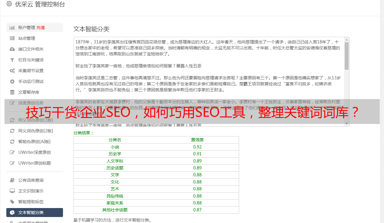 总结:本文主要内容重点介绍如何使用关键词工具快速整理词库,挖掘全站核心栏目,以上内容仅供参考!