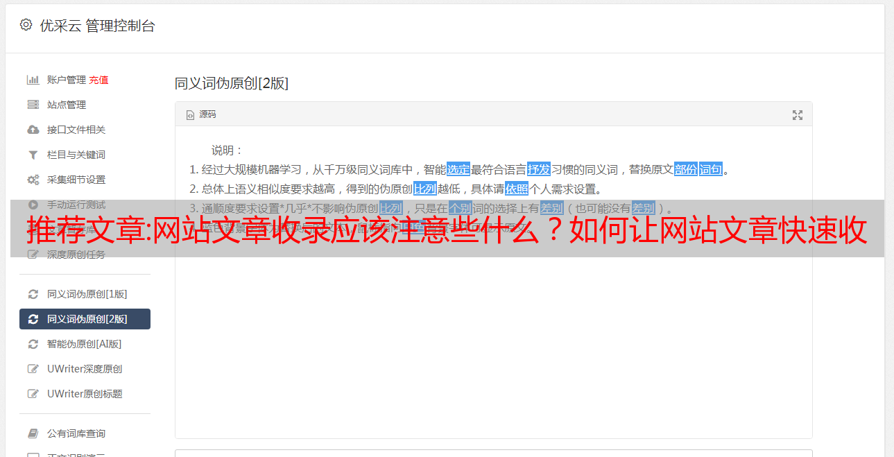 当我们在某个领域写很多seo文章的时候,可能会有一些重复或者很多重复,这就是网站文章没有收录的原因>,可以用一些工具检测文章的原创的度数,用自己的语言修改,特别是文章的首尾两段,一定要修改,后面是文章的标题,一个伪原创的文章是否可以是收录并有好的排名,这三点在文章中尤为重要重复检测。