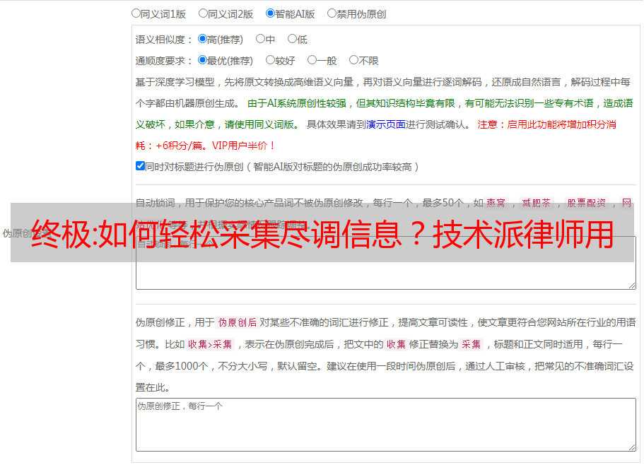 软件功能支持替换保持文章原意的速记词,每个词都有独特的随机替换算法;支持改变文章原意的段落的随机混淆和名词替换;替换为自定义关键词、自定义关键词、随机HTML插入文章;支持关键词/文章标题按密度或随机次数重复插入内容,增加搜索引擎相关性;为标题短语设计的句子混乱功能;伪原创 操作可以在单个 文章 或批量 TXT 上执行;所有词库都是开放的,您可以设置自己的词库;以多种方式支持多种词库。批量导入可视化 HTML 代码编辑。集成到智能博客助手后,可以在发布文章时动态执行伪原创操作。可以设置自己的关键词替换次数支持HTML和UBB代码的内容伪原创,可以自定义是否支持HTML和UBB代码之间的繁简转换操作,批量转换支持自定义替换,插入多个- 数据库管理支持云词库功能更新日志