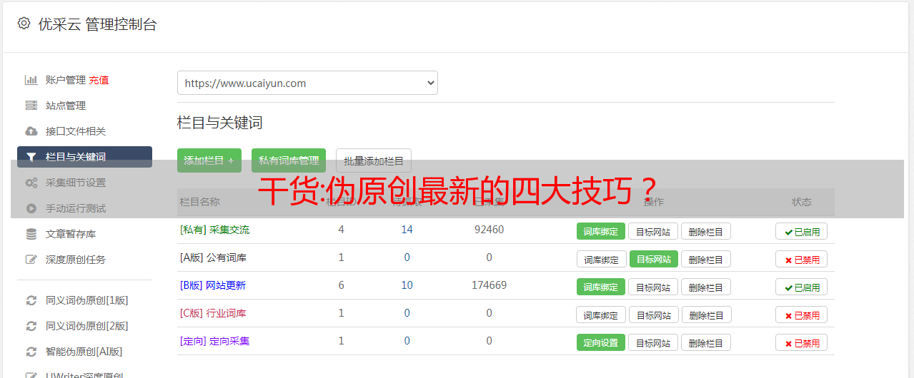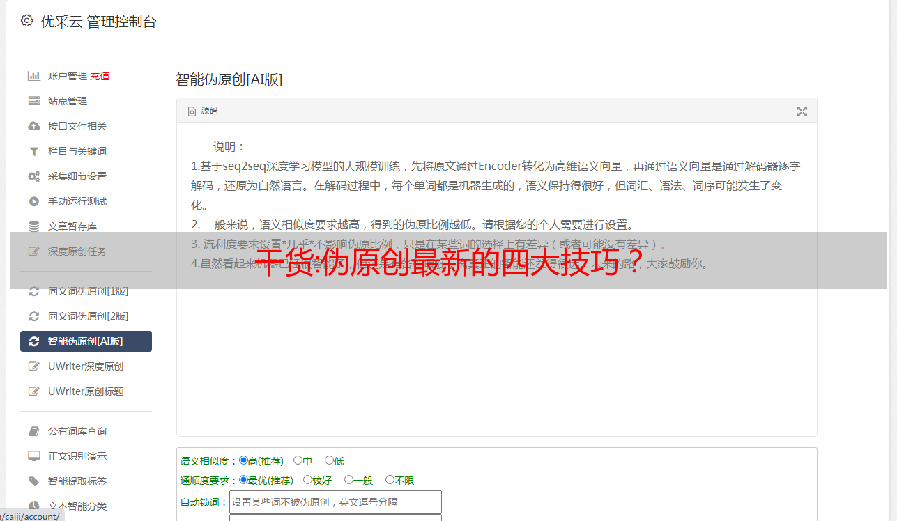 同理,进入网站采集内容,采集回来用AI伪原创重新生成一个文章,然后形成伪原创。这样做的好处是快速、省时、省力。缺点是有些部分可能需要手动修改。但也有一些好用的智能AI伪原创软件,如:智能伪原创AI软件优采云。你只需要在优采云的全网搜索你想写的文章文章,系统就会对软文的全文进行语义分析,实现智能化伪原点,然后重新创建一个新的文章应该只需要正常时间的1/4,可以大大节省时间。