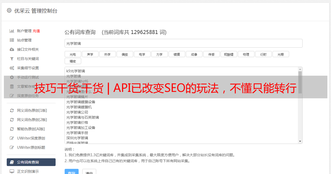优采云 发布时间: 2022-10-17 05:23技巧干货:干货 | API已改变SEO的玩法,不懂只能转行