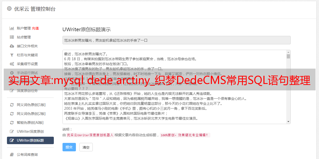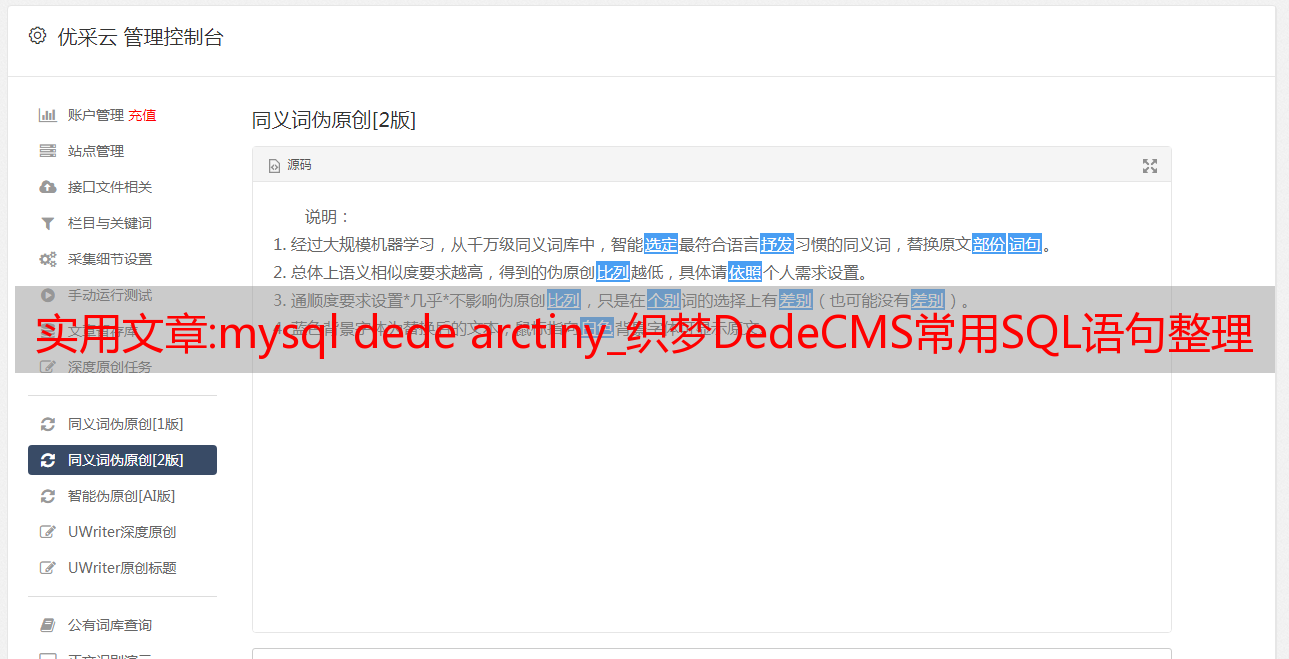 优采云 发布时间: 2022-10-21 01:14实用文章:mysql dede arctiny_织梦DedeCMS常用SQL语句整理