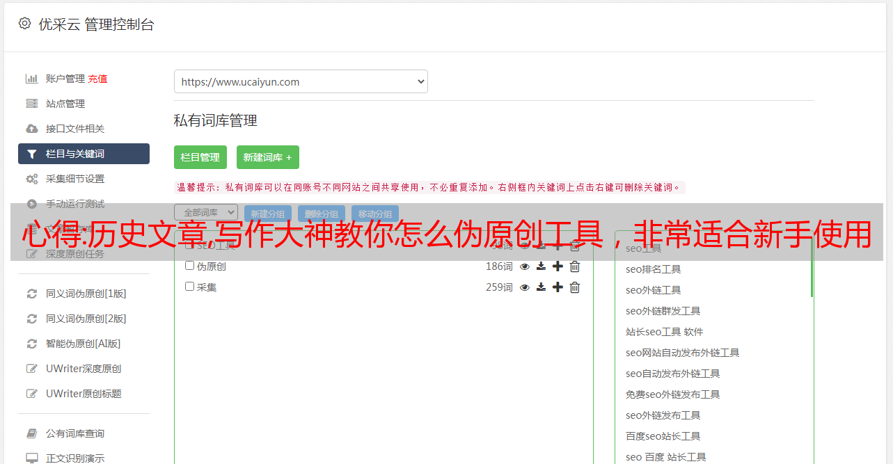 简单来说,就是一个价值全面教你怎么伪原创的工具,非常适合新手使用,特别是有时间一个个原文原网址对比,看自己的文章跟原文相似度,适合文笔稍微好点的朋友学习(我没有尝试,有兴趣的也可以试试)最方便的是,这个工具还有资料书目,让你随时复习看到过的好文章,非常的帮助非常的实用,
