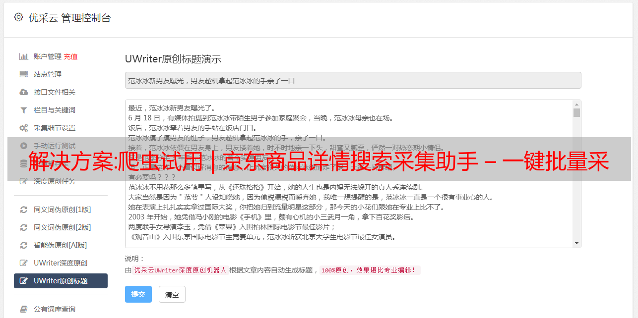 优采云 发布时间: 2022-10-22 01:14解决方案:爬虫试用 | 京东商品详情搜索采集助手 – 一键批量采集下载商品详情