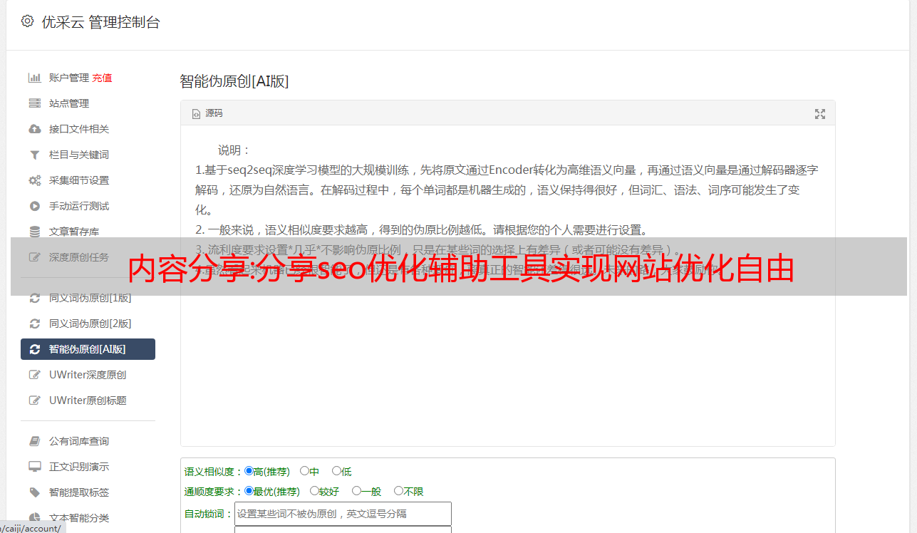 优采云 发布时间: 2022-10-24 02:43内容分享:分享seo优化辅助工具实现网站优化自由