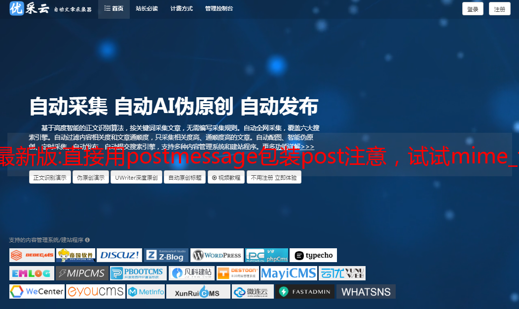 优采云 发布时间: 2022-10-30 11:21最新版:直接用postmessage包装post注意,试试mime_to_any_encoding>=gbk