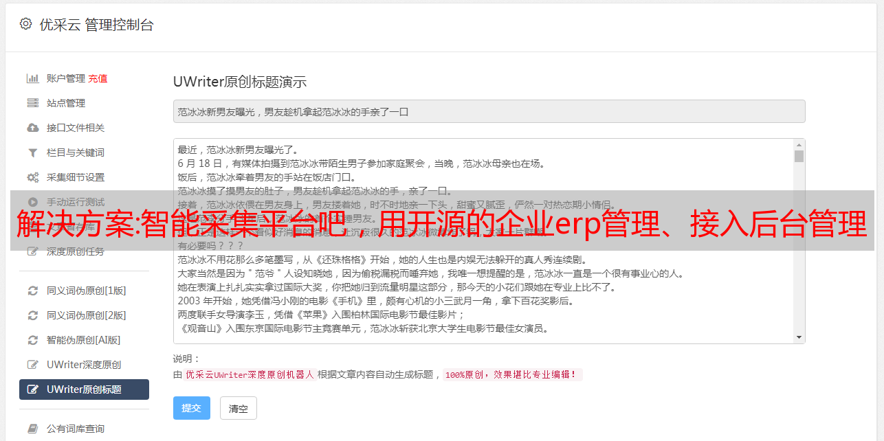 优采云 发布时间: 2022-10-30 19:17解决方案:智能采集平台吧,用开源的企业erp管理、接入后台管理