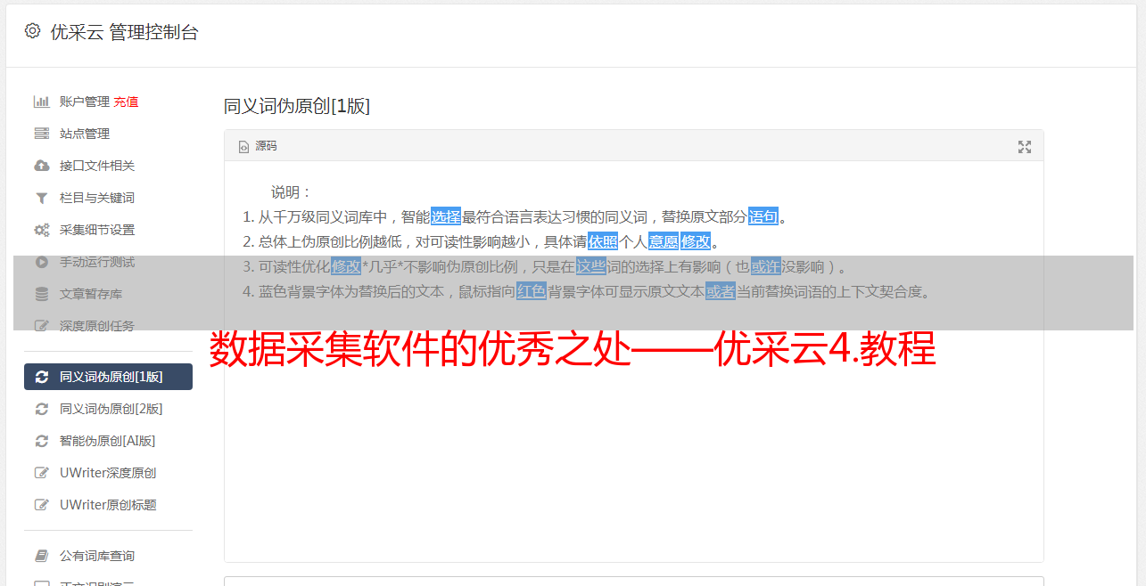 优采云 采集器的官方网站提供两种教程,一种是视频教程,每个视频大约5分钟,另一种是图形教程,这些都是手工授课的。阅读这两类教程后,您还可以查看它们的文档中心。它们也非常详细,基本上涵盖了软件的各种功能。