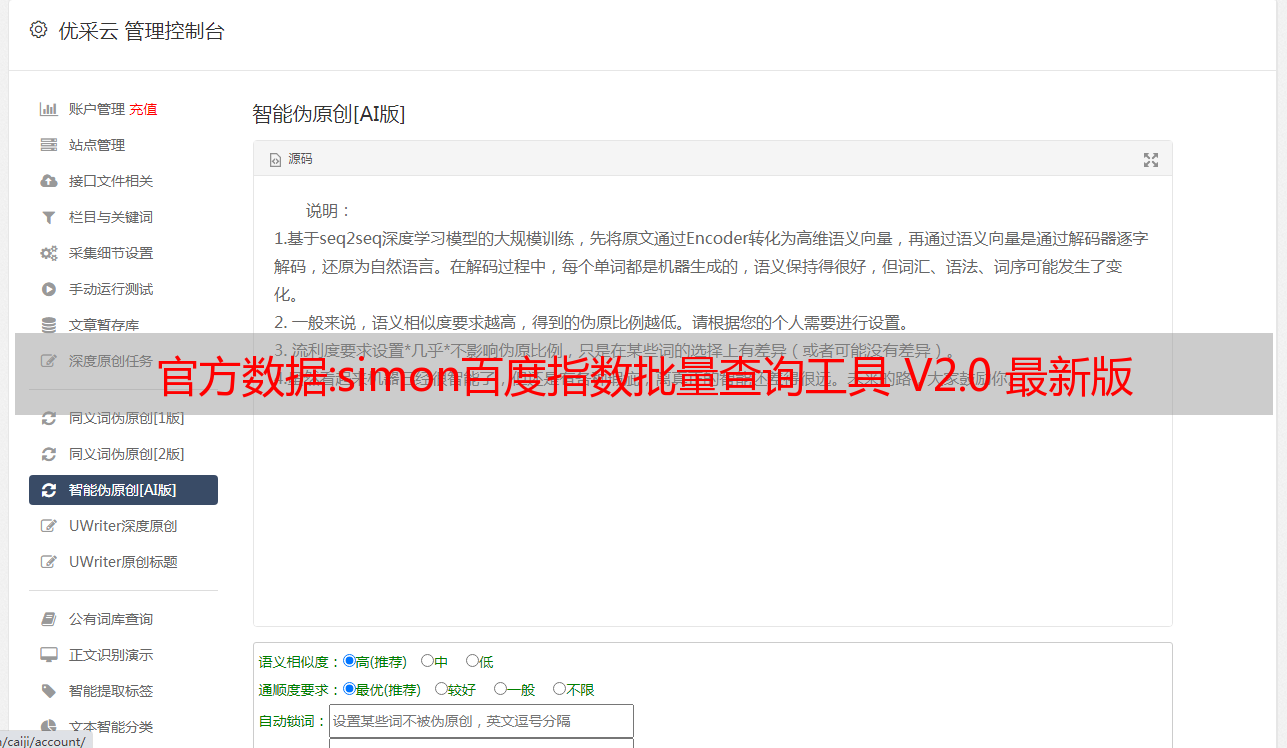 优采云 发布时间: 2022-11-01 09:54官方数据:simon百度指数批量查询工具 V2.0 最新版