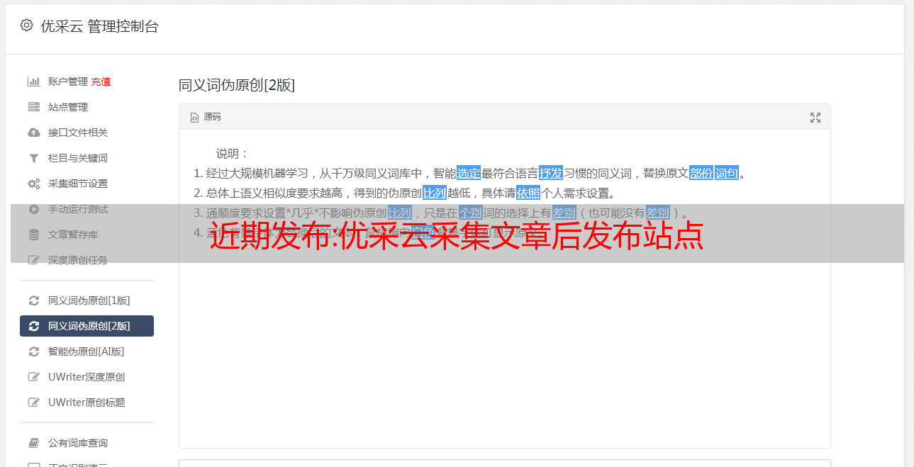 优采云通用文章采集器是一款文章采集软件,你只需要输入关键词,就可以采集各大搜索引擎页面和新闻,使用优采云采集后,不能直接发布各大cms,还需要找到相应的发布软件。使用起来比较麻烦。直到我遇到这个:采集+伪原创+发布工具。非常好用。