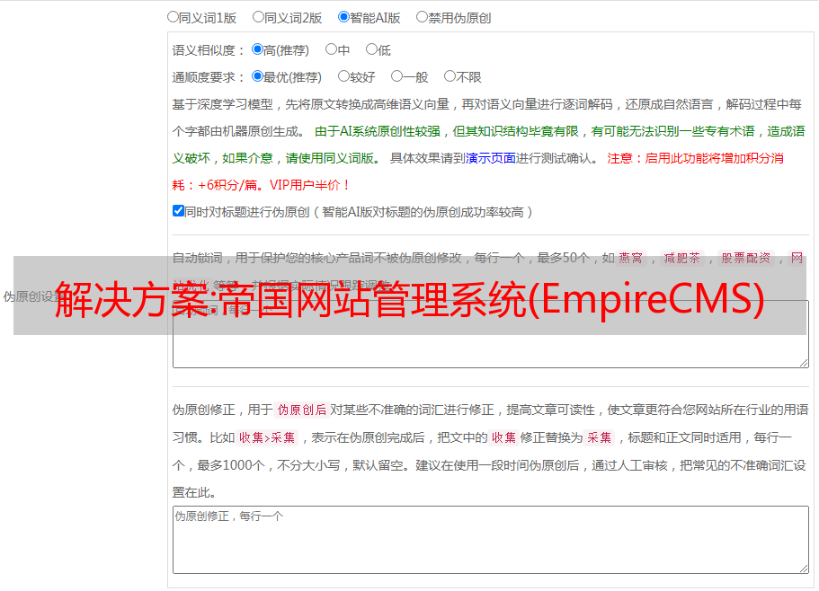 12.所见即所得编辑功能 Empirecms的系统界面与Word等Office产品紧密结合,可以直接从Word粘贴到Empirecms。用户也可以直接在Empirecms中进行文字排版处理,也可以在线进行图片的简单处理。系统支持插入图片、Flash、附件、音视频、超链接、表格等,系统会自动将插入的图片、Flash等文件上传到系统指定目录,文章图片直接上传从网上粘贴的可以自动保存到本地服务器,并且可以在图片的指定位置添加指定的水印。一切都是自动的。十三,信息内容支持存储文本 对于数据量非常大的信息内容,如小说、论文或其他内容量大的数据,非常不适合存储数据库。如果是数据库存储的话,单表的容量很容易爆炸,从而影响数据库的效率。所以帝国推出了这个功能,可以将这些大数据存储在文本文件中,系统对文件进行加密,安全有保障。信息量越大,程序就越好。14、全站全文搜索 全站全文搜索功能采用中文分词、编码转码和Mysql全文检索技术相结合,搜索效率很高。解决了同时查找多个表的数据,查找存储的文本模型的内容,大数据量情况下的全文查找解决方案。用户可以将每个数据表的数据导入全文检索,包括保存文本模型、主表或子表字段,支持设置导入字段和多表批量导入;并增加清理和搜索冗余数据的功能,可以删除已删除或无效的信息。