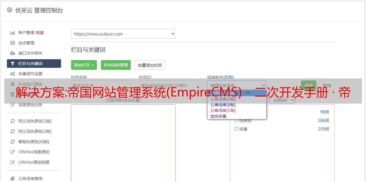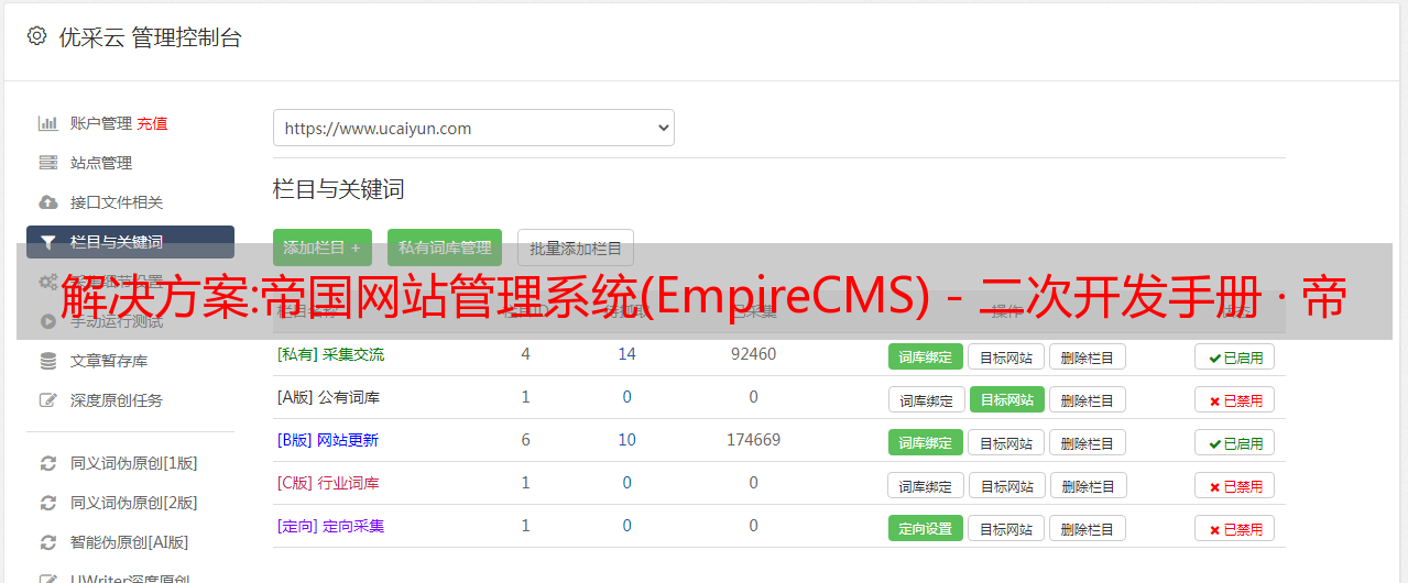 优采云 发布时间: 2022-11-01 15:24解决方案:帝国网站管理系统(EmpireCMS)-二次开发手册 · 帝国二次开发文档 ·