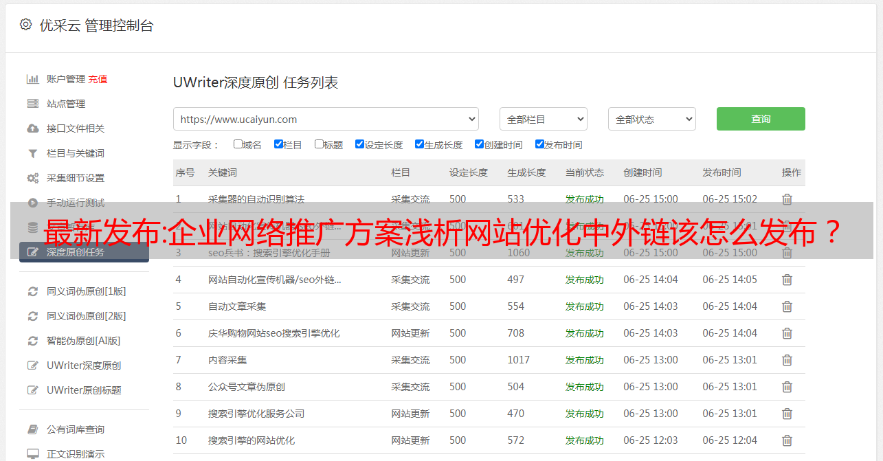 优采云是基于AI技术的智能内容创作平台,这个伪原创工具使用中文词库和语言模式进行文章原创。它更适合一些新手站长,如果你不知道如何更新原创文章,你可以使用这个工具来生成原创文章。