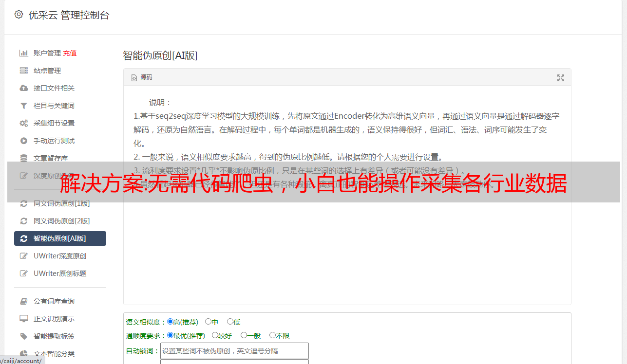 优采云 发布时间: 2022-11-08 17:20解决方案:无需代码爬虫,小白也能操作采集各行业数据