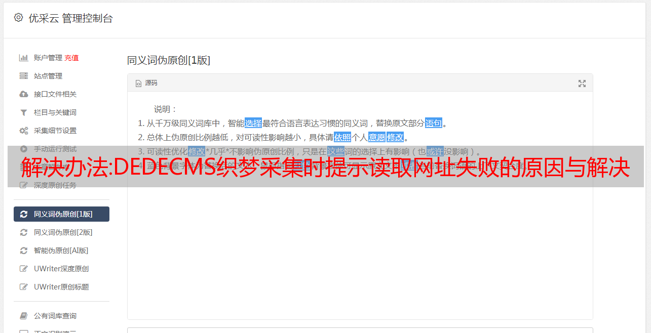 优采云 发布时间: 2022-11-09 12:45解决办法:DEDECMS织梦采集时提示读取网址失败的原因与解决方法