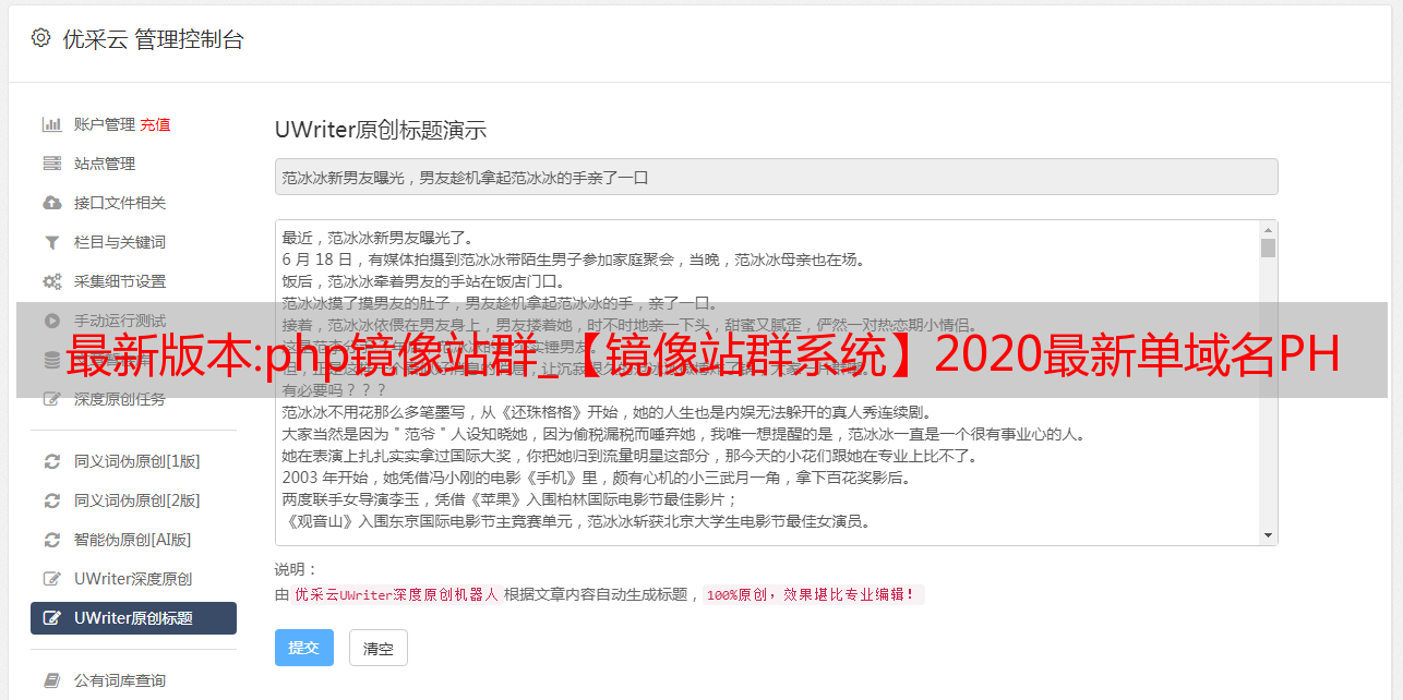 优采云 发布时间: 2022-11-11 06:16最新版本:php镜像站群_【镜像站群系统】2020最新单域名PHP网站克隆镜像网站程序源码