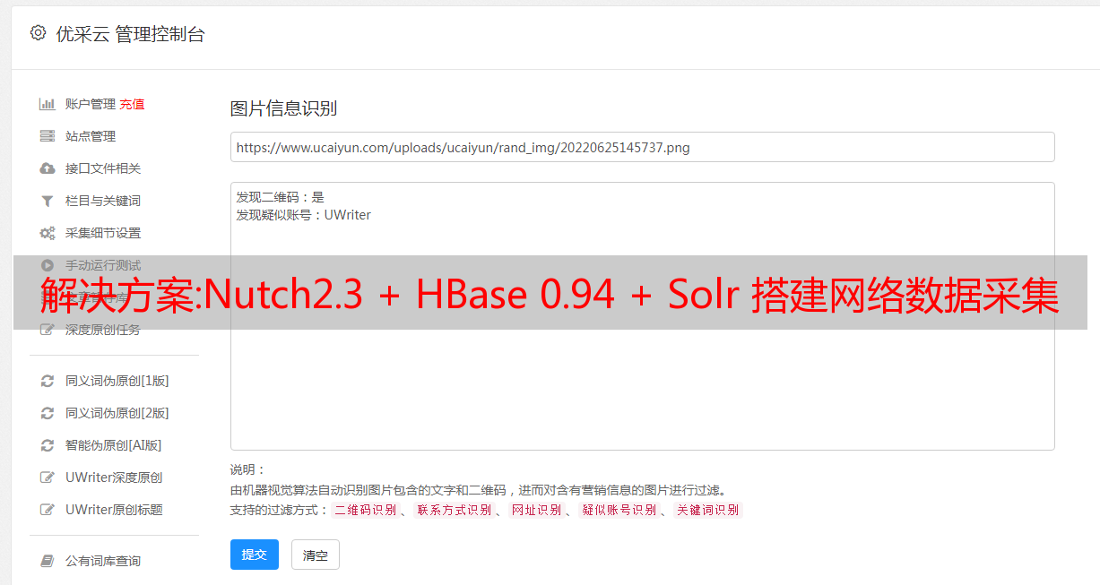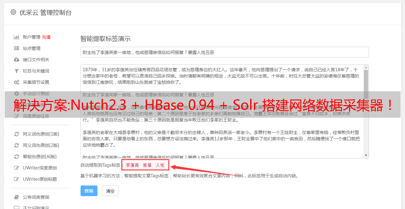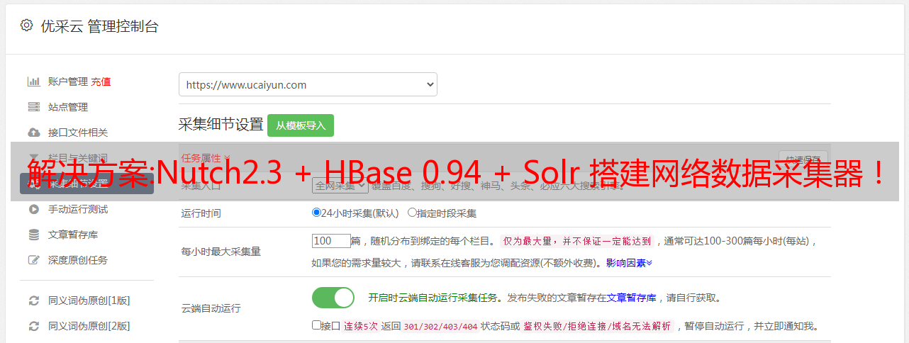 优采云 发布时间: 2022-11-12 07:50解决方案:Nutch2.3 + HBase 0.94 + Solr 搭建网络数据采集器!