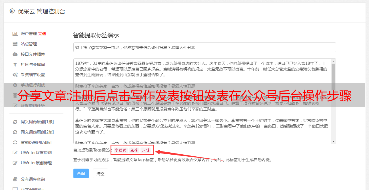 可采集文章发表在平台。注册后点击写作发表按钮发表。公众号后台操作步骤。新注册公众号点击写作发表按钮发表按钮:点击选择写作类型。写作类型选择:选择栏目类型。公众号后台操作步骤公众号发布文章后查看文章阅读数、点赞数、分享数,上传文章图片。获取更多流量主广告主资源。