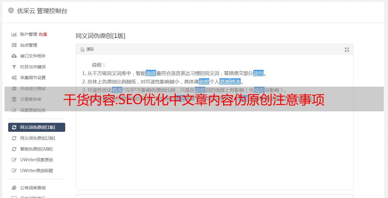 优采云 发布时间: 2022-11-16 04:24干货内容:SEO优化中文章内容伪原创注意事项