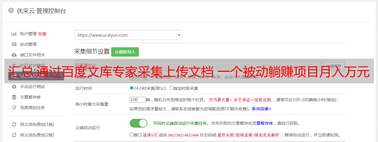 优采云 发布时间: 2022-11-17 06:33汇总:通过百度文库专家采集上传文档 一个被动躺赚项目月入万元