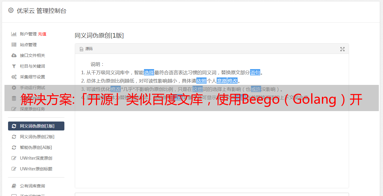 优采云 发布时间: 2022-11-17 13:39解决方案:「开源」类似百度文库,使用Beego(Golang)开发的开源文库系统