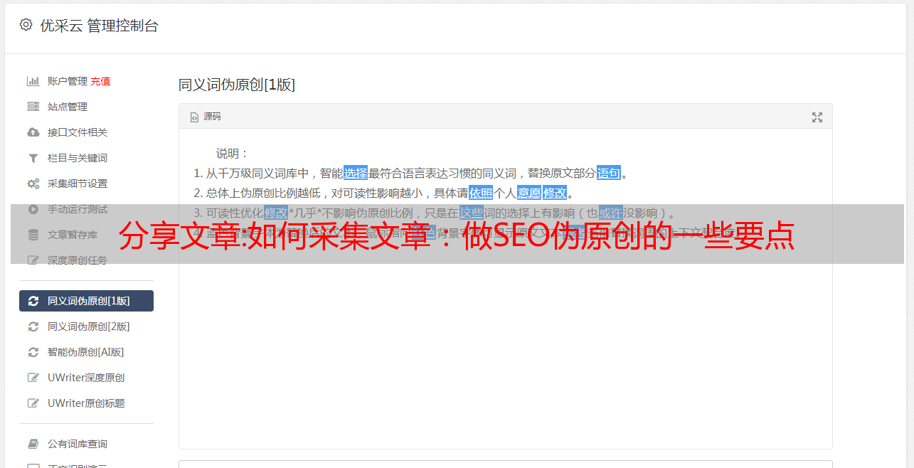 每天写原创文章对SEOers来说很无聊,但如果网站不更新,排名就无法保证,所以一些SEOer把目光投向了伪原创工具。事实上,市场上有很多伪原创工具,但实际效果并不相同。许多早期的伪原创工具仍处于同义词替换阶段,但随着近年来科学技术的进步,人工智能也加入了伪原创的行列。先进的伪原创工具利用*敏*感*词*的深度学习系统,自动学习数亿个语料进行训练,已经可以达到高原创、句子流畅、语义一致的效果。在这里,我推荐优采云AI伪原创工具。