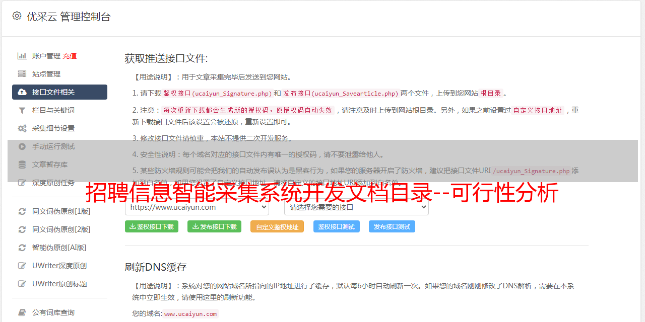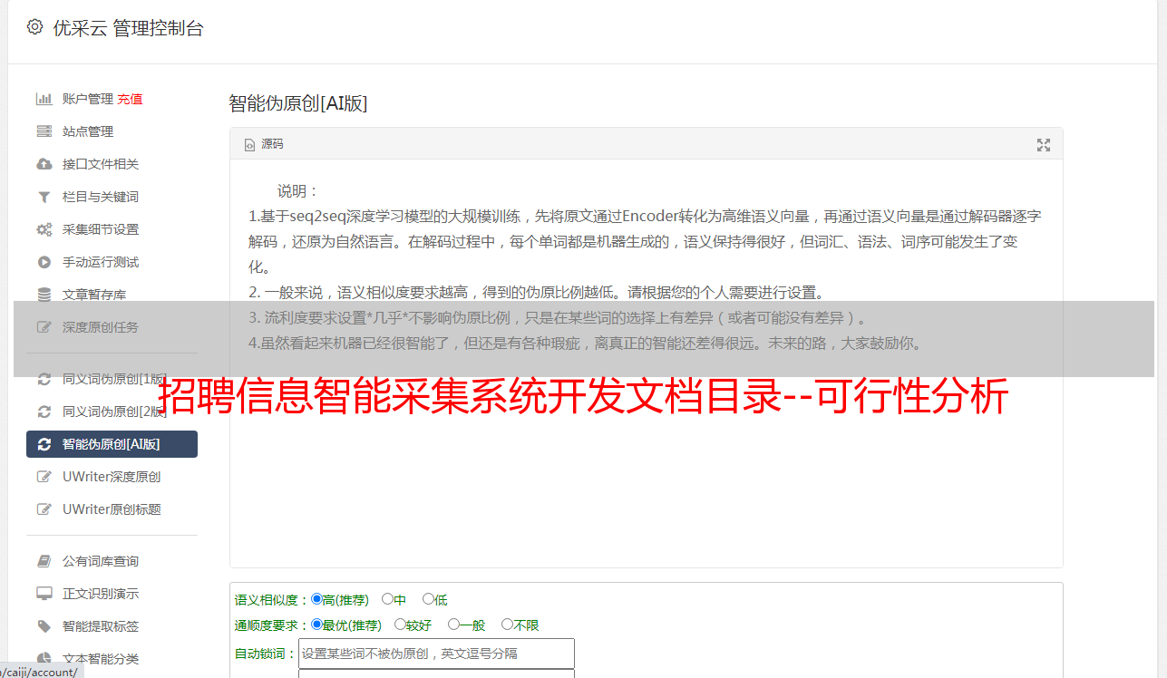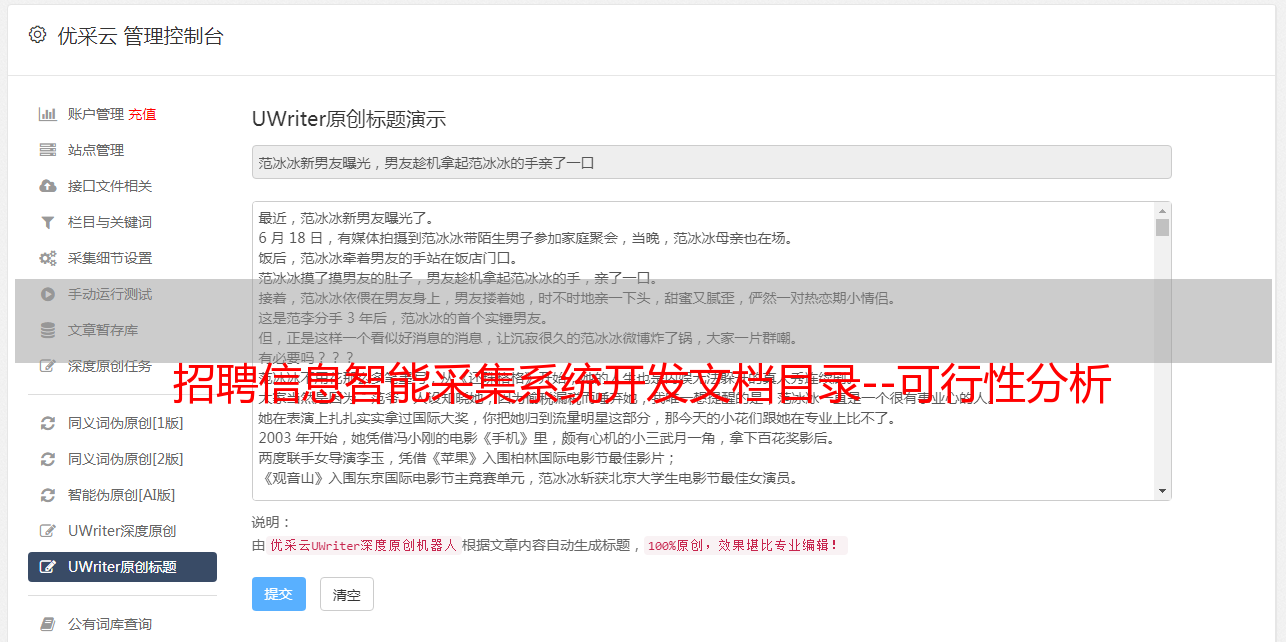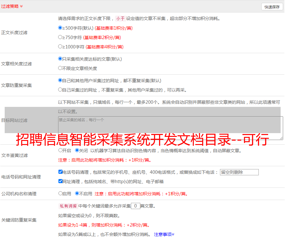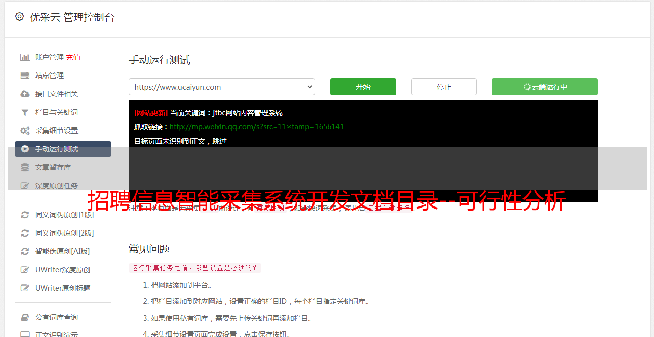 ---------- 203412热门职位---------------------------------- ----------------------- 20413公告栏------------------------ ----------------------------------------------- 20414后台管理特征 - - - - - - - - - - - - - - - - - - - - - - - - - --------------- 20五个系统测试------------------------------- --------------- 22六项主要技术和七个项目前景。大家好。在这里,我将向您介绍一套应用程序系统,这些系统集成了个性化信息采集并搜索并申请在线招聘信息。招聘信息只能是采集系统通过调查。许多有很多人选择工作的城市没有专门针对该地区的招聘信息。 网站有需要的人可以通过有限的渠道获得许多招聘信息。招聘信息不是很针对性。当地信息不能一口气。充分利用这时,如果在该地区有一组完善且位置合适的职位招聘网站,它将为这些人带来更舒适的用户体验,并使他们的信息更完整。因此,开发该系统是非常可行的。 1系统*敏*感*词*显示4 采集器管理员网站管理员用户2用户3用户12角色定义工作信息智能采集系统角色描述序列号名称行为描述1 采集器管理员1设置采集规则采集招聘信息2标准化数据3向采集 2 网站管理员发布的信息1更新和管理职位信息2更新和管理用户信息3根据用户要求提交简历3用户1搜索和浏览招聘信息2感兴趣的感兴趣职位提交简历3享受网站提供的其他服务3系统要求的简要说明31获取网站源信息设置目标网络设计采集规则数据库数据导入32搜索作业信息5通过作业信息搜索指定范围内的信息了解公司详细信息。为感兴趣的职位信息添加书签。将简历发送给感兴趣的公司。 33消息管理。在网站上浏览并回复用户的意见和建议。管理后端管理员的交换信息。 34用户管理。分析结果有助于网站优化添加,删除,修改和管理用户信息的操作和管理。 35管理员管理以对管理员级别进行分类。根据类别分配权限。管理和操作管理员信息。 36管理数据信息设置。位置信息源网站选择要增加的信息内容