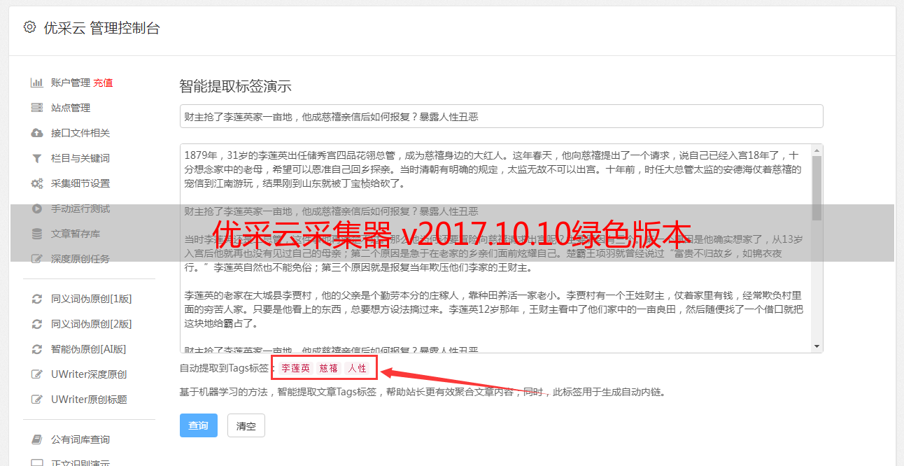 优采云 发布时间: 2020-08-07 10:16优采云采集器是由优采云 Software启动的便捷,实用且功能强大的免费Web数据采集器. 集成了内容采集和信息发布功能,它支持将采集的数据批量上传到各种CMS(decms,empire CMS,phpcms),BLOG(wp,zlobg,BBS(discuz,phpwind)和其他主流程序),并且内置了小巧方便的在发布界面中,可以扩展到功能强大,免费实用,绿色免费安装的任何程序(php,asp,C#,java等). 有需要的用户请下载并体验!
