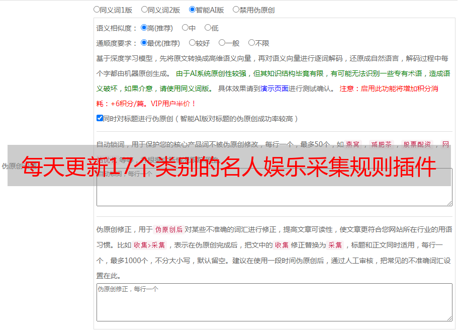 此插件可以通过天人官方采集平台进行转移,以获取每天更新的32种以上明星娱乐信息类别的文章(不采集旧文章),这意味着您可以获取最新更新的文章. 在整个网络上实时显示. . 可配合自动收款插件实现全自动免维护更新网站功能.