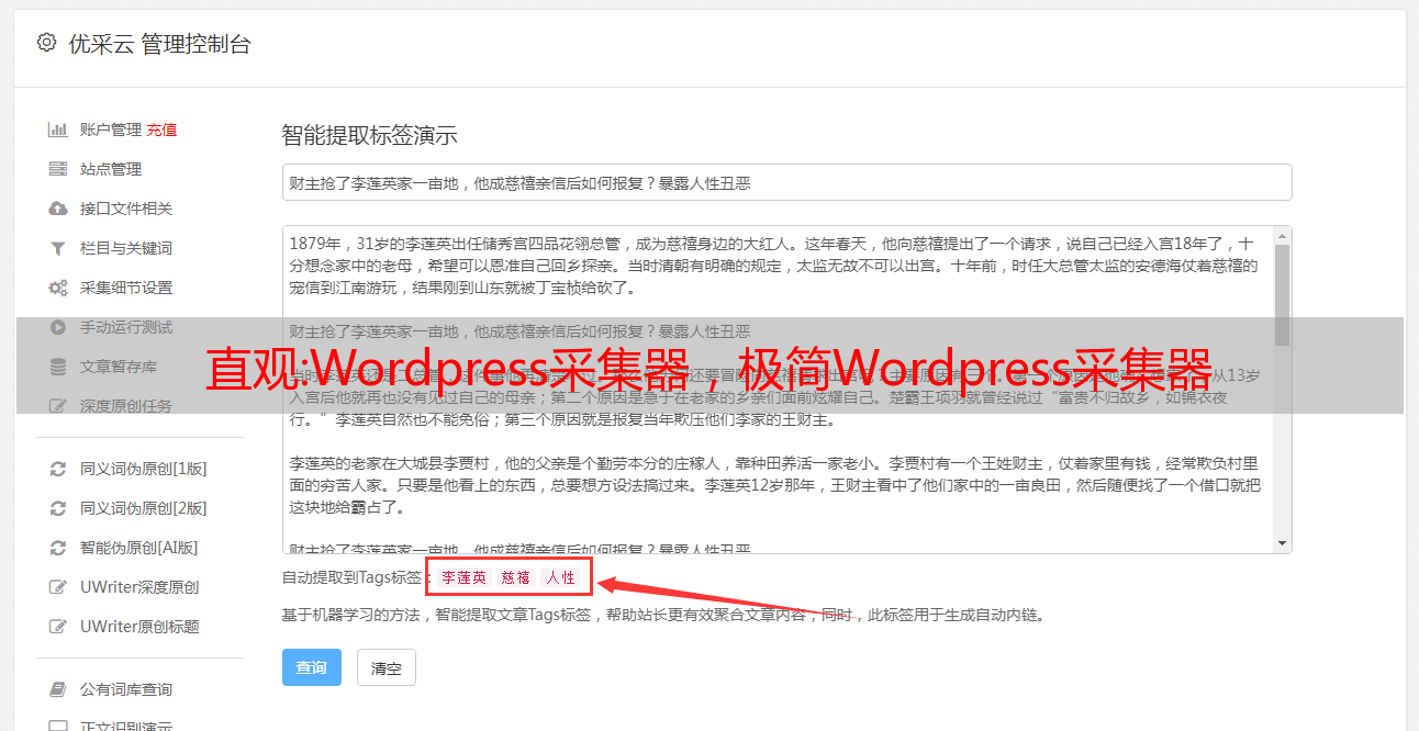 wordpress采集器 有针对性和增量采集 支持采集后本地重新创建或直接自动伪原创 发布推送。内置中英翻译和简繁体互换。输入关键字,点击获取我们需要的指定内容。