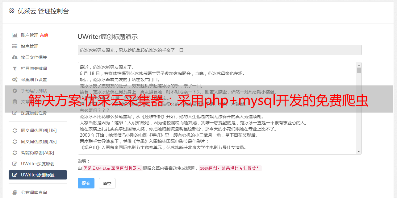 优采云 发布时间: 2022-12-07 17:17解决方案:优采云采集器:采用php+mysql开发的免费爬虫
