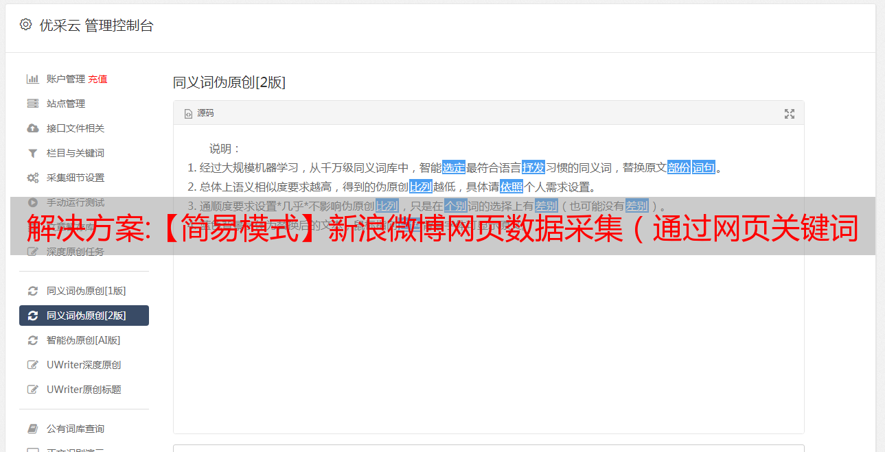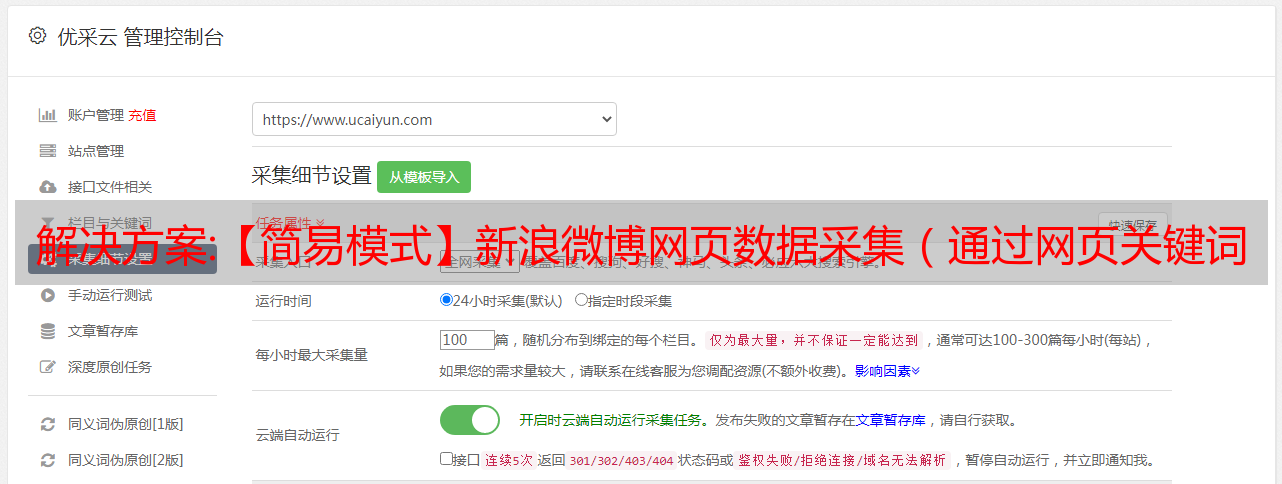 优采云 发布时间: 2022-12-08 08:21解决方案:【简易模式】新浪微博网页数据采集(通过网页关键词搜索)