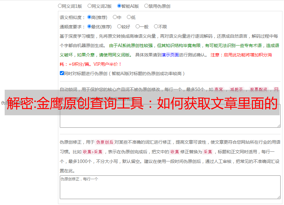 首先我们要解决一个问题:如何获取文章里面的指纹,这个问题在文章伪原创的时候会经常用到。那么今天的方法如下:你只需要输入关键词,并复制文章里面的内容,然后点击金鹰原创检测—伪原创。在我的文章编辑页面上,我们会看到我们需要对文章进行的处理过程和结果统计信息。分析一篇文章里面的指纹,其实很简单,一般是结构化数据语料库的建立和索引,从这篇文章的指纹信息里,检测出该文章的标签。