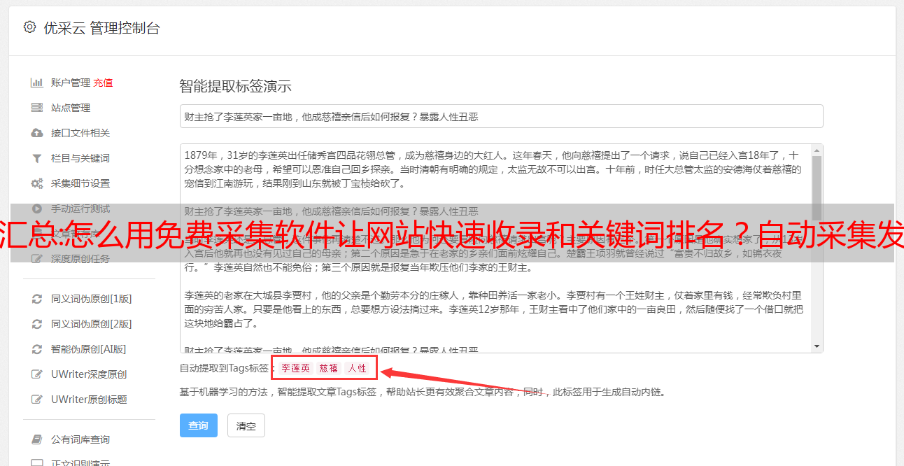 与其他采集软件相比,这款采集软件基本没有任何规则,更不用说花大量时间学习正则表达式或html标签,一分钟即可上手,只需输入关键词采集可以实现(采集软件也自带关键词采集功能)。全自动挂机!设置任务,自动执行采集伪原创,发布并主动推送到搜索引擎。