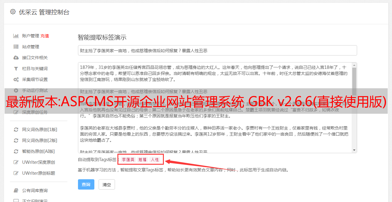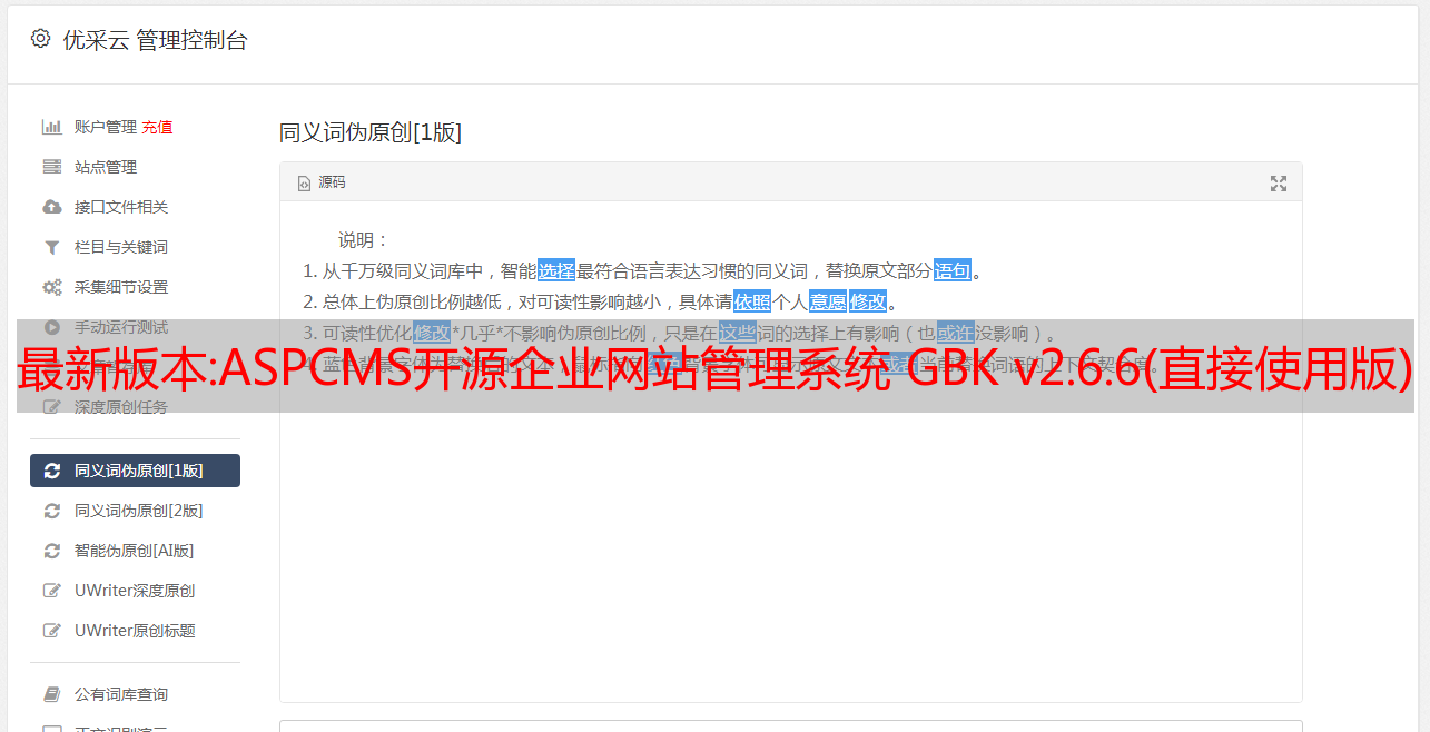 优采云 发布时间: 2022-12-14 05:54最新版本:ASPCMS开源企业网站管理系统 GBK v2.6.6(直接使用版)