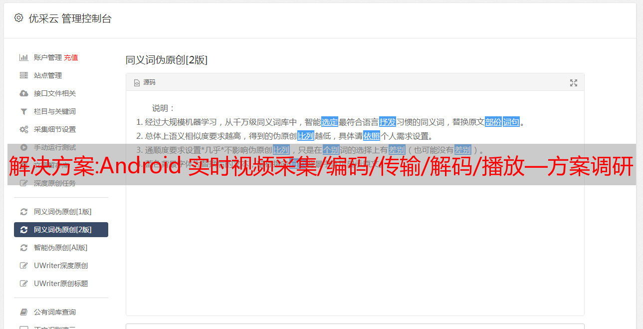 优采云 发布时间: 2022-12-15 11:35解决方案:Android 实时视频采集/编码/传输/解码/播放—方案调研