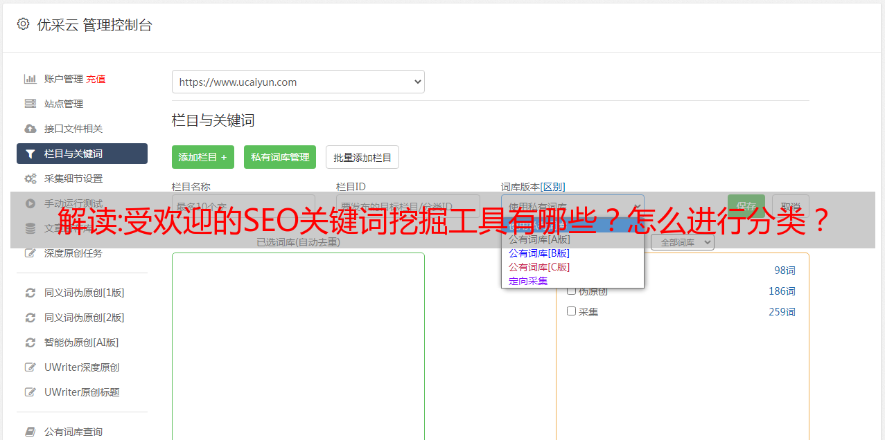 优采云 发布时间: 2022-12-16 18:15解读:受欢迎的SEO关键词挖掘工具有哪些?怎么进行分类?