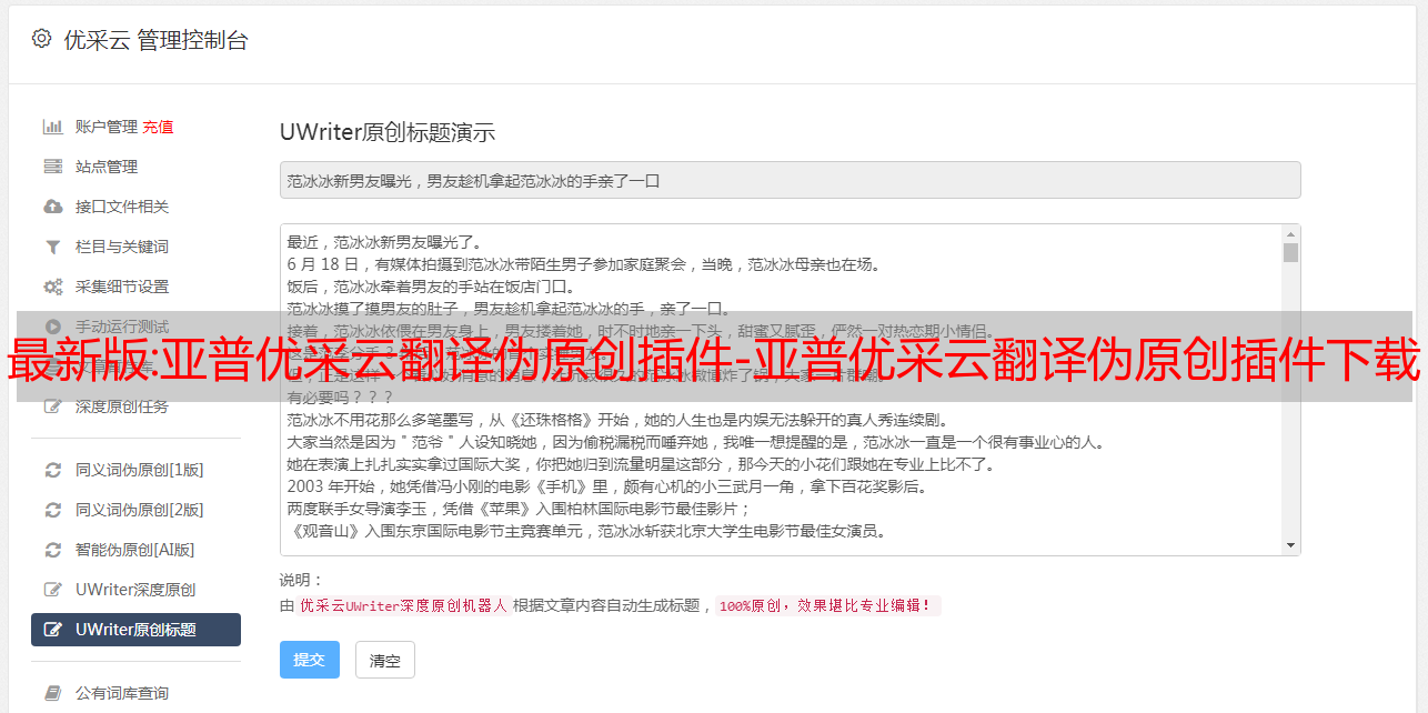 优采云 发布时间: 2022-12-18 01:43最新版:亚普优采云翻译伪原创插件-亚普优采云翻译伪原创插件下载 v3.0官方版