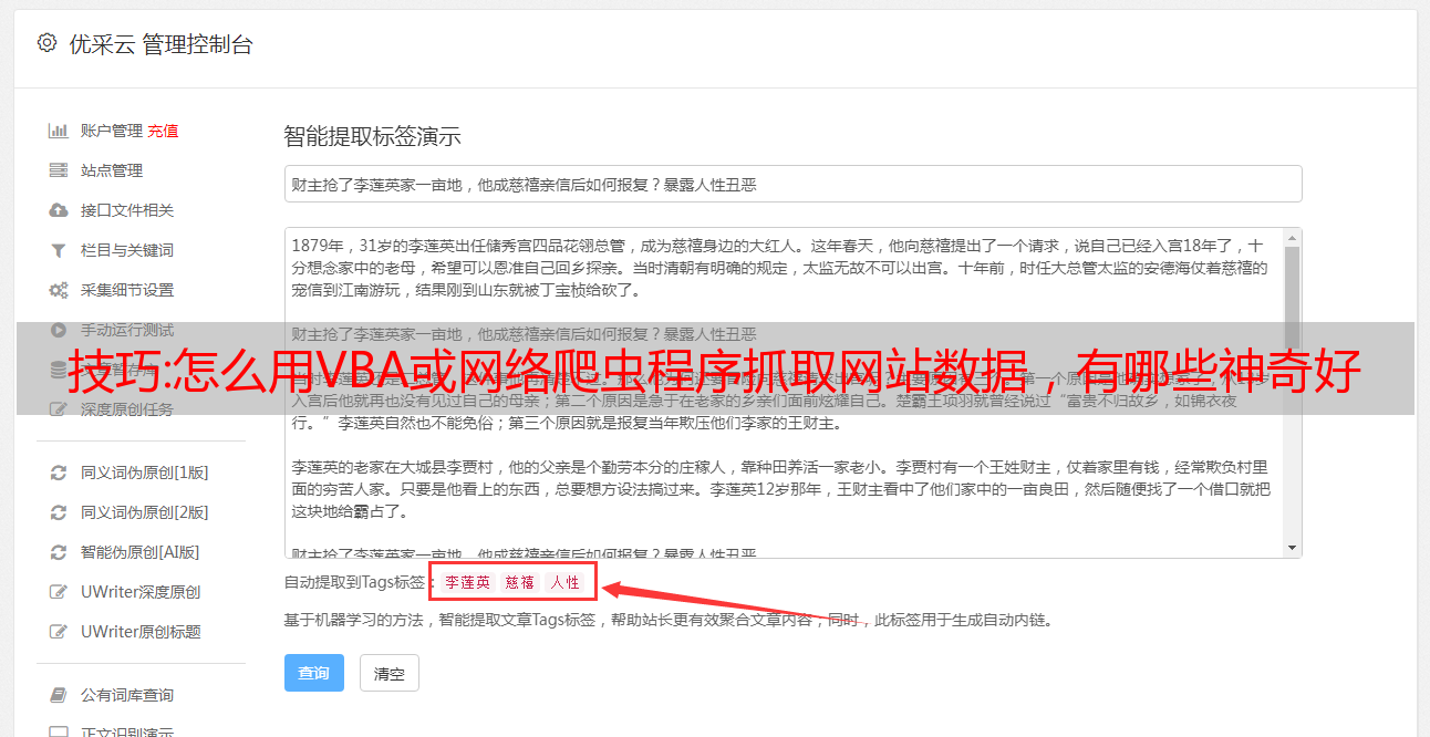 优采云 发布时间: 2022-12-20 01:50技巧:怎么用VBA或网络爬虫程序抓取网站数据,有哪些神奇好用的数据采集工具