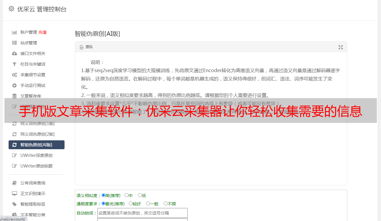 总之,优采云采集器是一个非常好的工具,既方便快速地获取所需要的信息,又能方便快速地归类整理出所需要的信息;同时它也具有很好的安全性能。如今想要使用手机版文章采集软件就不得不使用优采云旗下开发的优采云采集器。想要体验优采云释义详情请前往www.ucaiyun.com体验吧~
