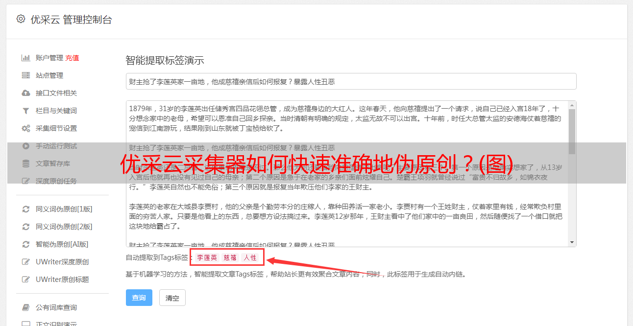 总之,优采云采集器是一款卓越的在线英文伪原创工具:它不但可以快速地帮助用户生成海量有效、正确格式化的伪原创文章内容,而且还能够大大减少人工工作时间和劳劕力。如果你正在寻找一款方便、快速、准确、高效地利用在线英文伪原创来扩大影响力、促进业务发展的工具,那么你应该来试试优采云采集器(www.ucaiyun.com)。