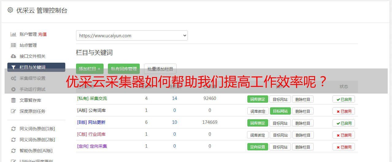总之,使用文章采集超能带来诸多好处——既能大大地提高工作效率也能为生产创造出更多价值。因此想要大幅度地提升工作效率的人士都应该好好考虑使用一下优释云释集器——www.ucaiyun.com上面有详尽的相关介绍与使用方法。