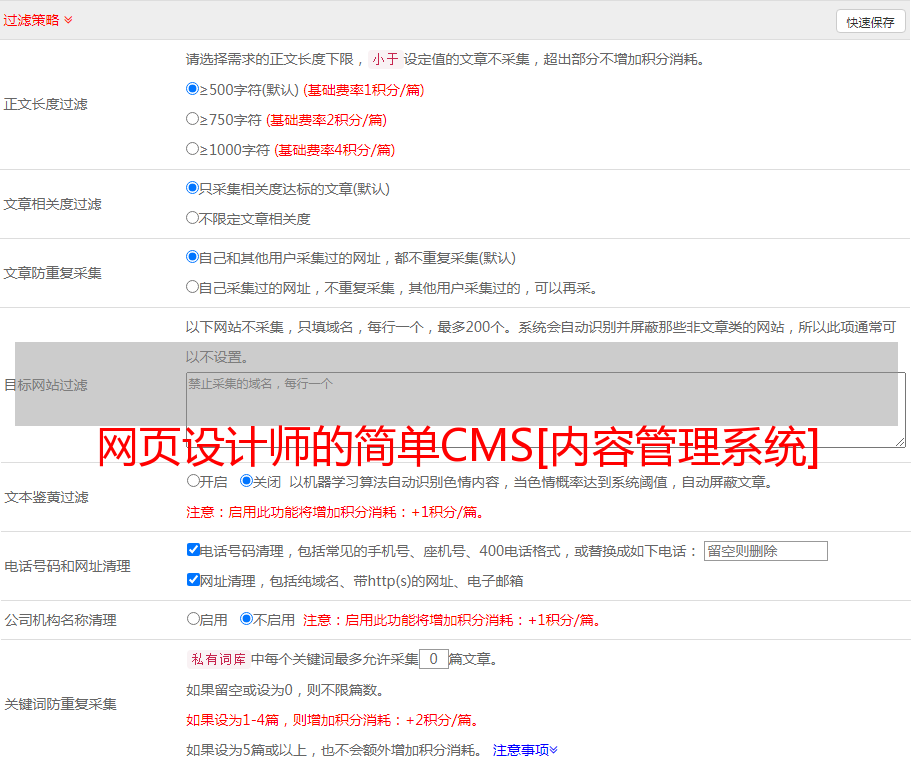 cms Made Simple 是一个易于使用的 网站 内容管理系统,内容简单稳定。使用PHP,MySQL和Smarty模板引擎开发。它具有:基于角色的权限管理系统、智能缓存机制(仅在需要时从数据库中获取)、基于向导的安装和更新机制,占用系统资源少,还包括文件管理、新闻发布和RSS模块, 等等。 。主要特点