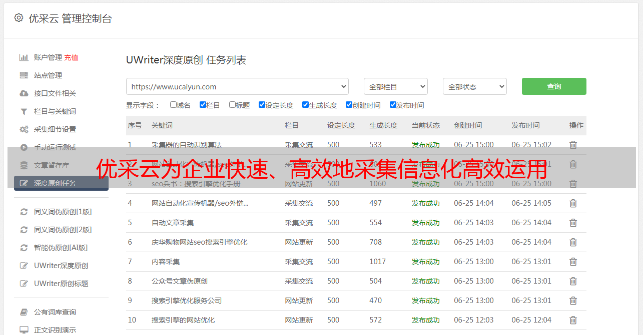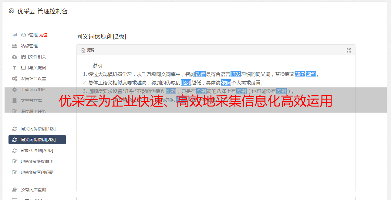 优采云独特之处不仅在于能够快速准确地采集各类新闻媒体、社交媒体上的相关信息,而且还能够帮助企业高效利用所采集到的信息。它能够根据用户要求对所采集到的信息进行归类、整理、去重、无中生有、关键字标注以及内容补充;能够根据用户要求对所采集到的文章内容进行语义分析并生成新闻图片、话题图片以及观点图片;还能够根据用户要求将所采集到的内容进行形式上的转化以便后期使用。
