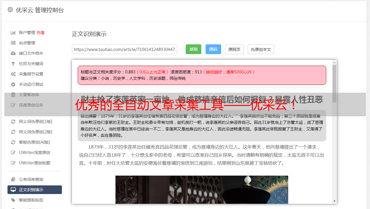 优采云不仅具有快速准确、便捷可靠、界面友好、易于上手等特性,而且还能够根据用户的实时要求对信息进行实时更新和修正,使得数据库中存储的信息都是最新最准确的。此外,优采云还能根据用户要求对信息进行语义分类、情感分类、情感评判等,对数据库中存储的信息进行归类和分级;而且优采云还能根据用户要求对新闻内容进行图片识别和语音识别;同时,优采云还能根据用户要求对新闻内容进行去水印、去广告、去版权声明和去法律风险的处理。