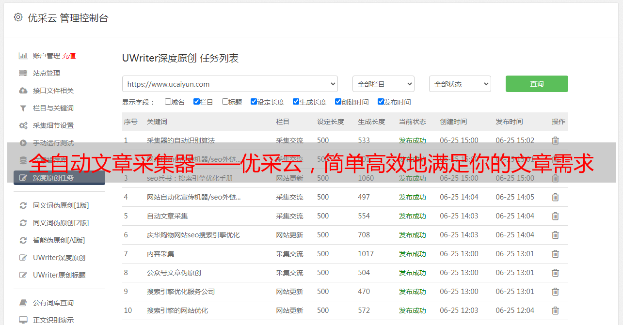 优采云是一款强大的全自动文章采集器。它不仅可以快速地实现对多个网站、多个关键词的内容检索,而且还能够根据用户的要求对采集内容进行进一步分类、整理。不仅如此,使用优采云还可以实现对原始内容的去重、去广告、去水印、图片处理等一系列复杂的功能。有了优采云,就可以省去人工麻烦,节省很多时间和精力。